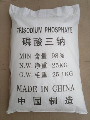 【性 質(zhì)】 磷酸三鈉為白色或微黃色結(jié)晶,相對(duì)密度為1.62,熔點(diǎn)73.4°C,易溶于水,不溶于乙醇和二硫化碳,水溶液呈堿性,對(duì)人體皮膚有一定侵蝕作用。1%水溶液PH值為12.1,在干燥的空氣中易風(fēng)化。在100°C時(shí)即失去十一個(gè)結(jié)晶水,212°C以上時(shí)即變?yōu)闊o(wú)水物Na3PO4,能與酸或鈣,鎂,鐵的鹽類起復(fù)分解反應(yīng)。